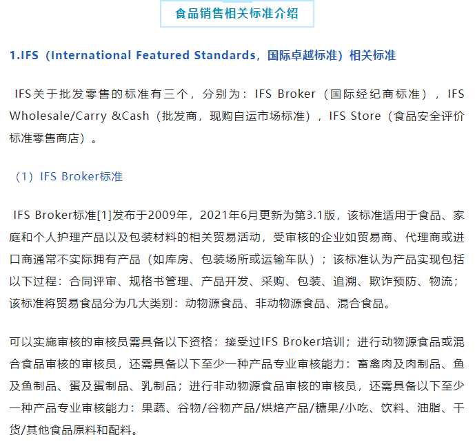 從2009年開始,IFS、BRCGS、BSI對食品貿易、零售發布了多個標準。2021年4月1日,中國合格評定國家認可委員會(CNAS)發布CNAS-SC 180《食品安全管理體系認證機構認可方案》,將零售納入認可范圍;同年12月6日,發布CNAS-SC 185《危害分析與關鍵控制點(HACCP)體系認證機構認可方案》,也將零售納入認可范圍。