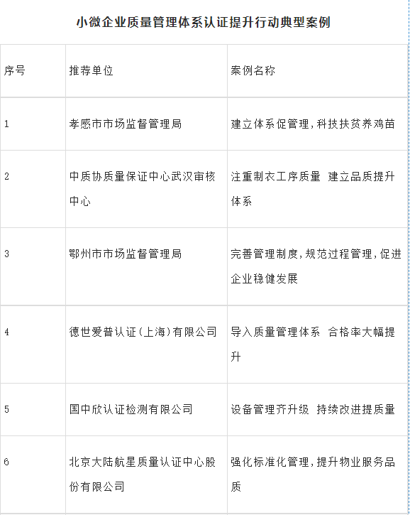近日,為進一步發揮優秀典型的引領帶動作用,結合網絡投票結果,湖北省市場監管局將16個小微企業質量管理體系認證提升行動典型案例和10個檢驗檢測促進產業優化升級行動典型案例予以通報。詳情如下: